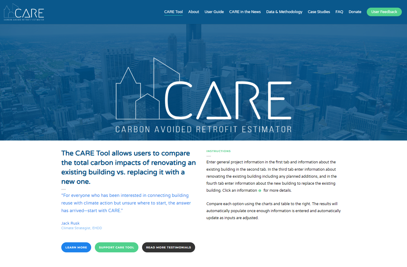 The CARE (Carbon Avoided: Retrofit Estimator) Tool is used for estimating and comparing the embodied, operating, and avoided carbon impacts and benefits of reusing and upgrading existing buildings or replacing them with new construction. CARE is the first tool that uses high-level inputs to generate valuable, early decision-making information about and when and how building reuse is the right carbon decision.